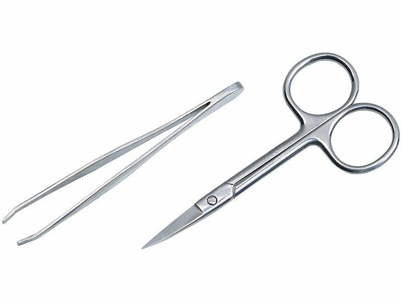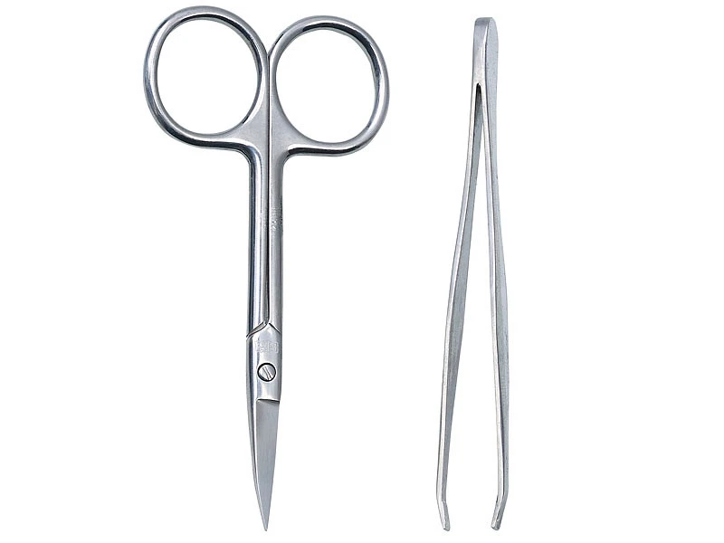 - Dimensions ciseaux : 90 x 40 mm, pincette : 88 x 12 mm, poids total : 23 g
