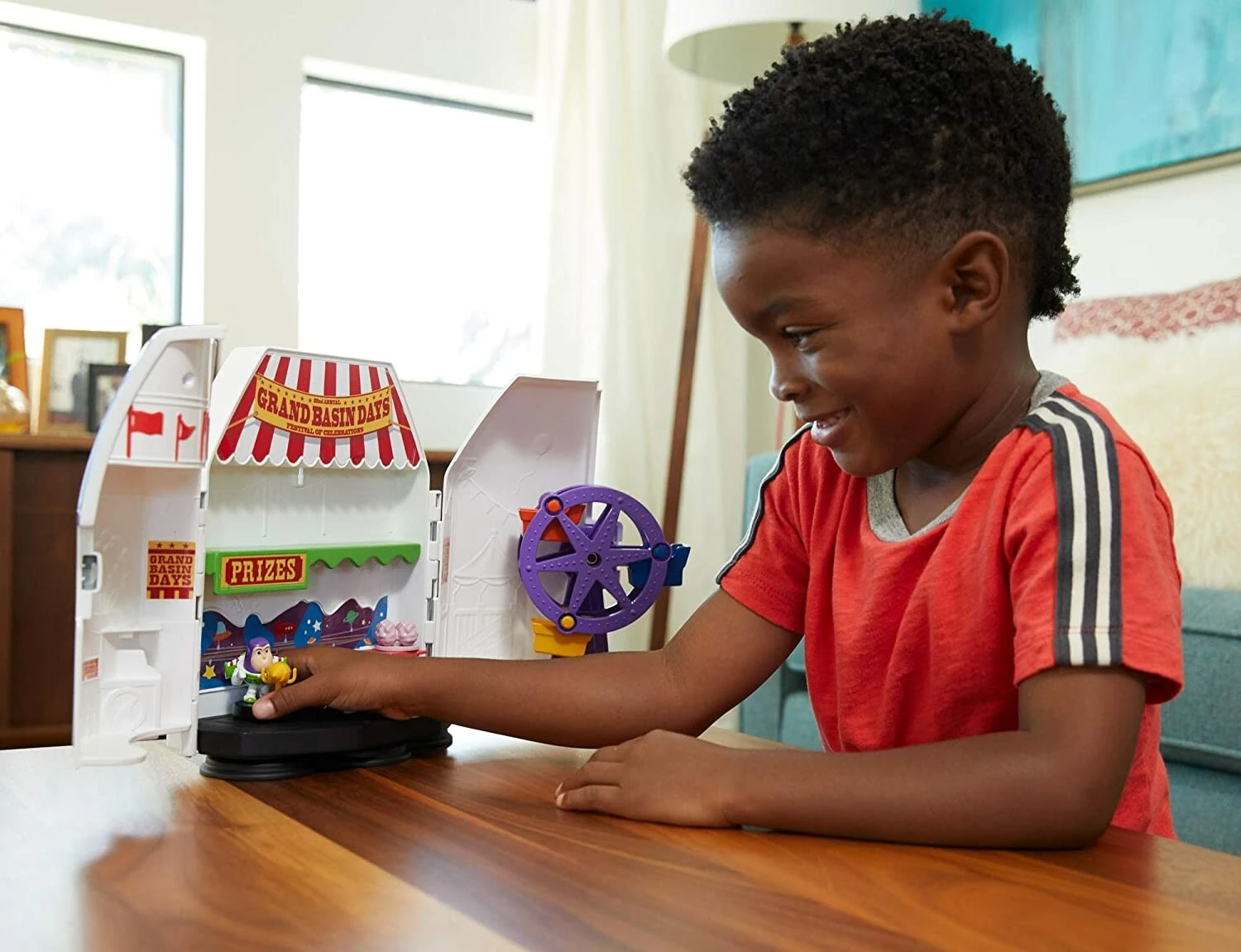 Le design extérieur de ce coffret rappellera aux fans de la saga Toy Story le vaisseau spatial Star Command de Buzz l’Éclair. Le coffret carnaval aventure peut accueillir jusqu’à 15 mini-figurines Toy Story. C’est très pratique pour transporter toute ta collection. Une grande roue et une plateforme tournante se trouvent à l’intérieur du vaisseau spatial. Retrouve également 1 mini-figurine Buzz l’Éclair exclusive pour compléter ta collection.