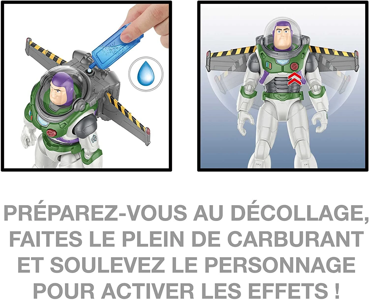 Cette magnifique figurine du Ranger de l’espace mesure 30 cm et elle est équipée d’un jet pack avec ailes rétractables et réservoir à eau pour décoller vers de nouvelles aventures. Remplissez la cartouche du propulseur d’eau à l’aide la pipette fournie, préparez-vous au décollage en pressant sur un des boutons sur la poitrine de Buzz et soulevez le pour encore plus d’action avec sons et lumières et trainée de vapeur réaliste.
