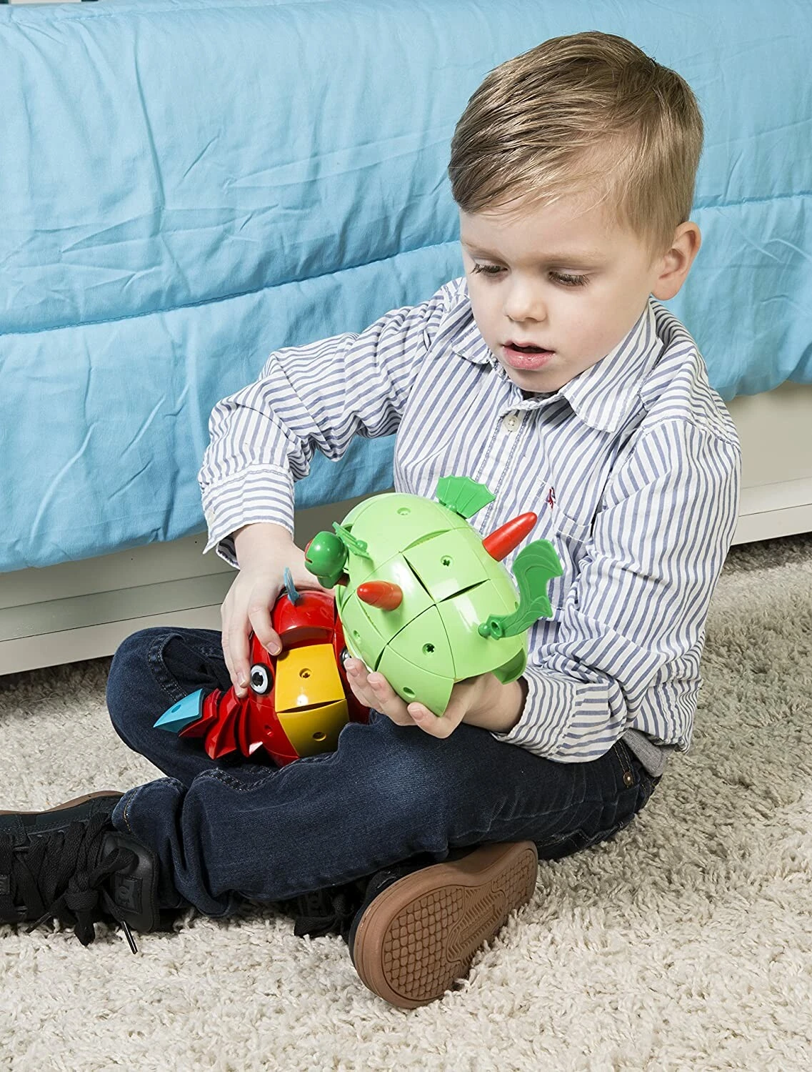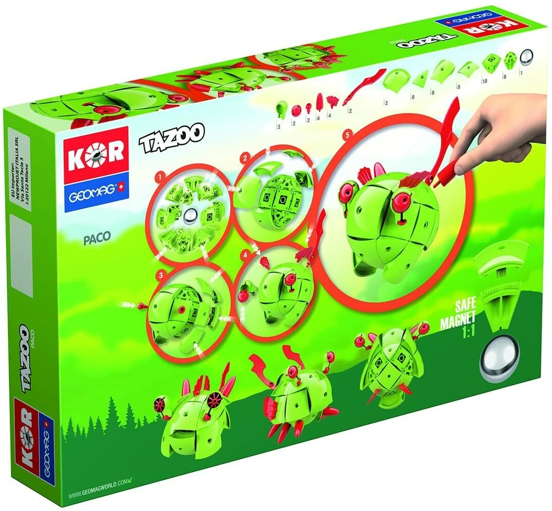 La collection Kor Tazoo permet de construire des créatures amusantes afin de stimuler l’imagination des plus jeunes. Paco est un petit crapaud… ou plutôt un caméléon… enfin on ne sait pas trop. Grâce à la structure magnétisée, vous pouvez changer la forme Paco sans avoir à le déconstruire. En effet, les pièces aimantées tournent autour de la bille centrale, permettant de transformer votre construction à volonté !