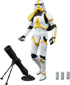 Ce soldat des forces impériales dispose d’un casque et d’une armure détaillés, une épaulière de couleur jaune distinctif, une sous-combinaison noire, un sac à dos militaire, un mortier articulé et un blaster.