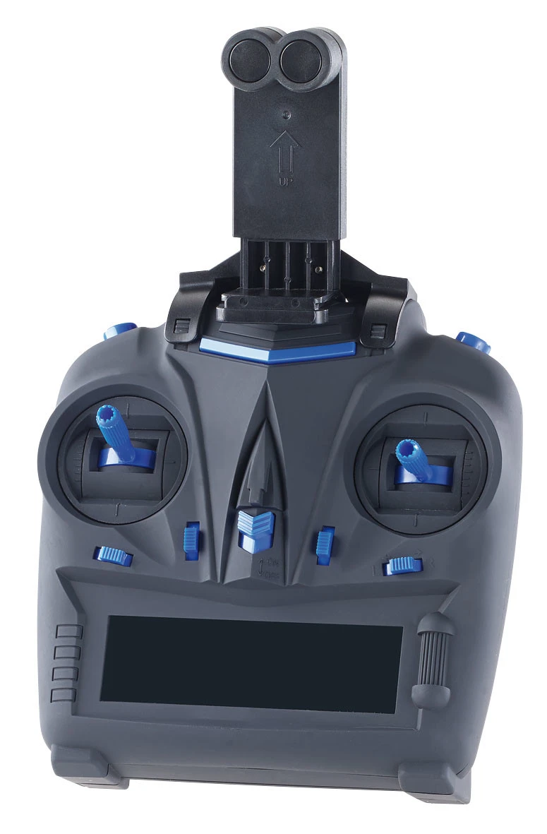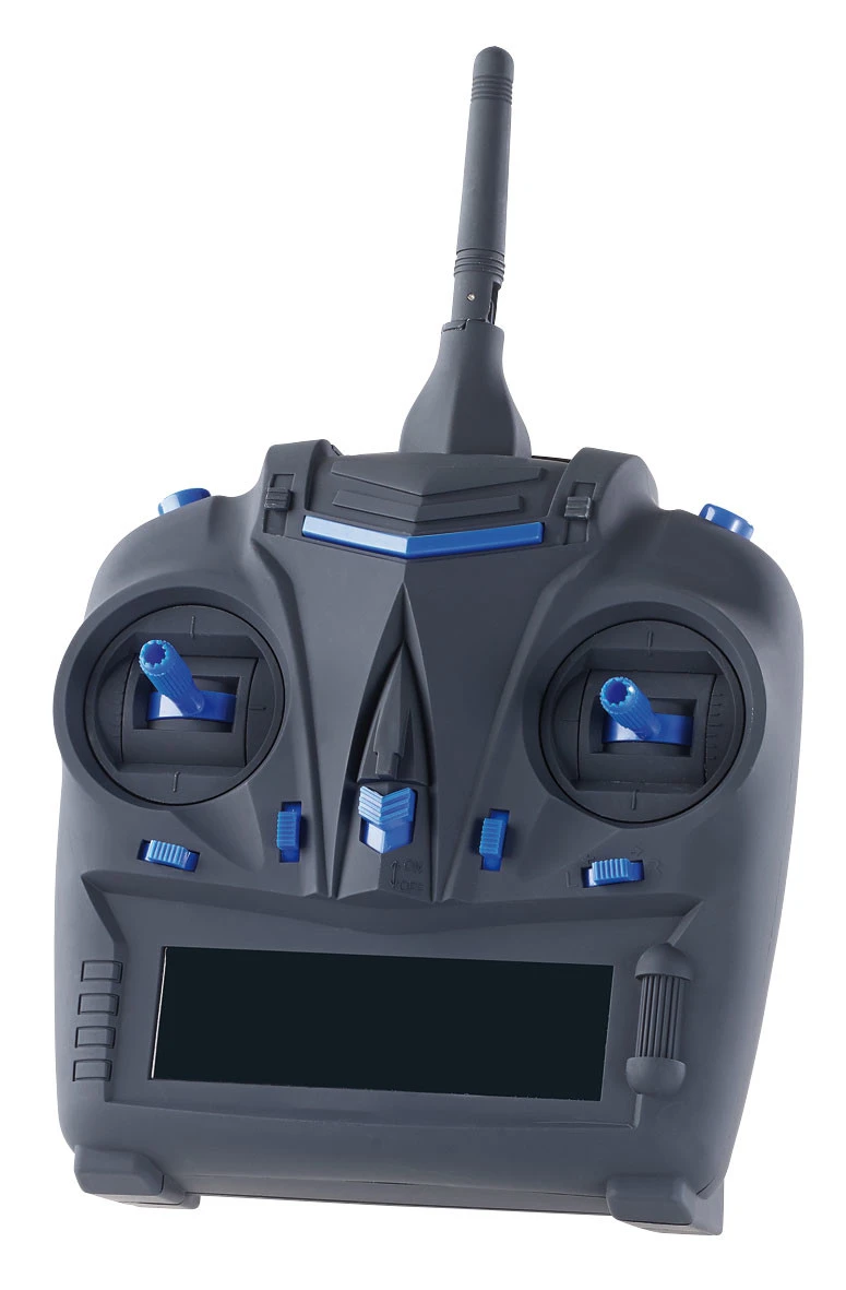 - Leviers et boutons de contrôle pour : marche/arrêt, accélération, rotation à gauche/droite, voler vers l’avant/l’arrière/la gauche/la droite, basculer, ajustement de la rotation gauche/droite, ajustement du vol vers l’avant/l’arrière/la gauche/la droite, vitesse