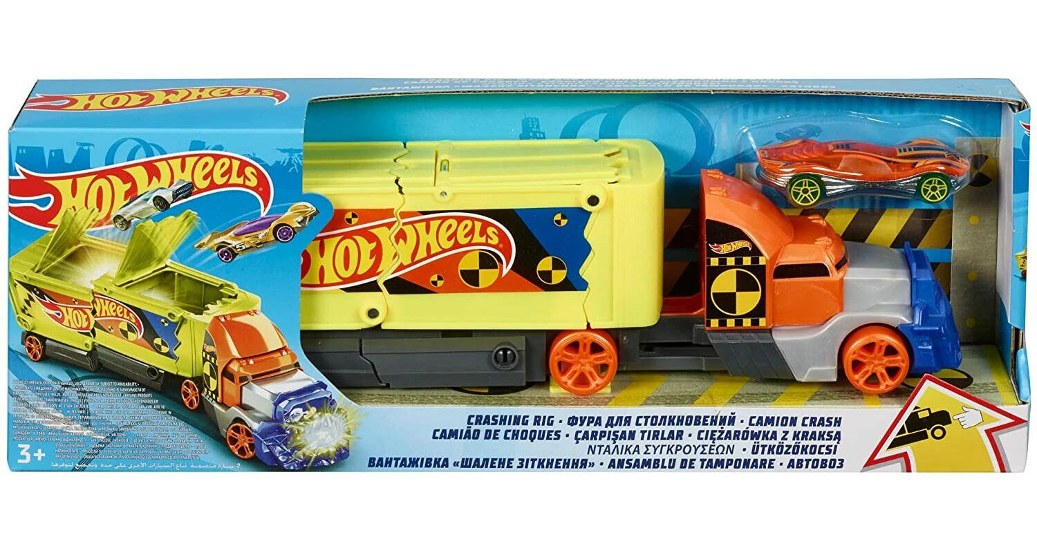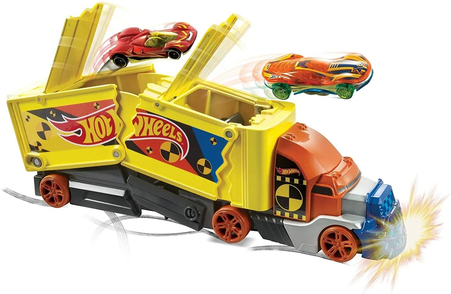 Ce camion crash d’Hot Wheels a été spécialement conçu pour subir des dommages et éjecter automatiquement deux vehicules. Un choc à l’avant et c’est toute la remorque qui explose.