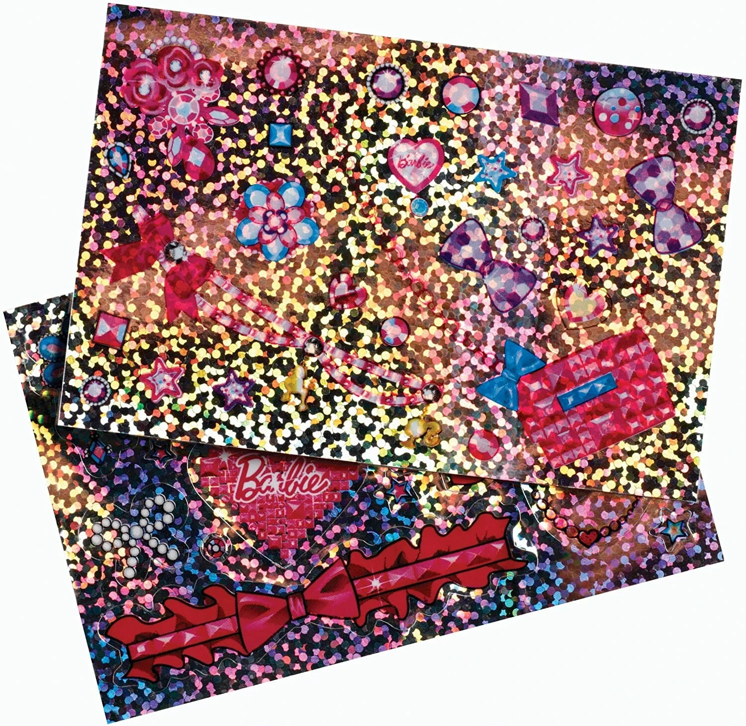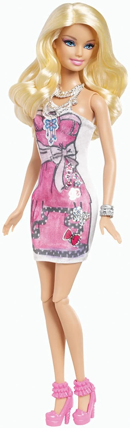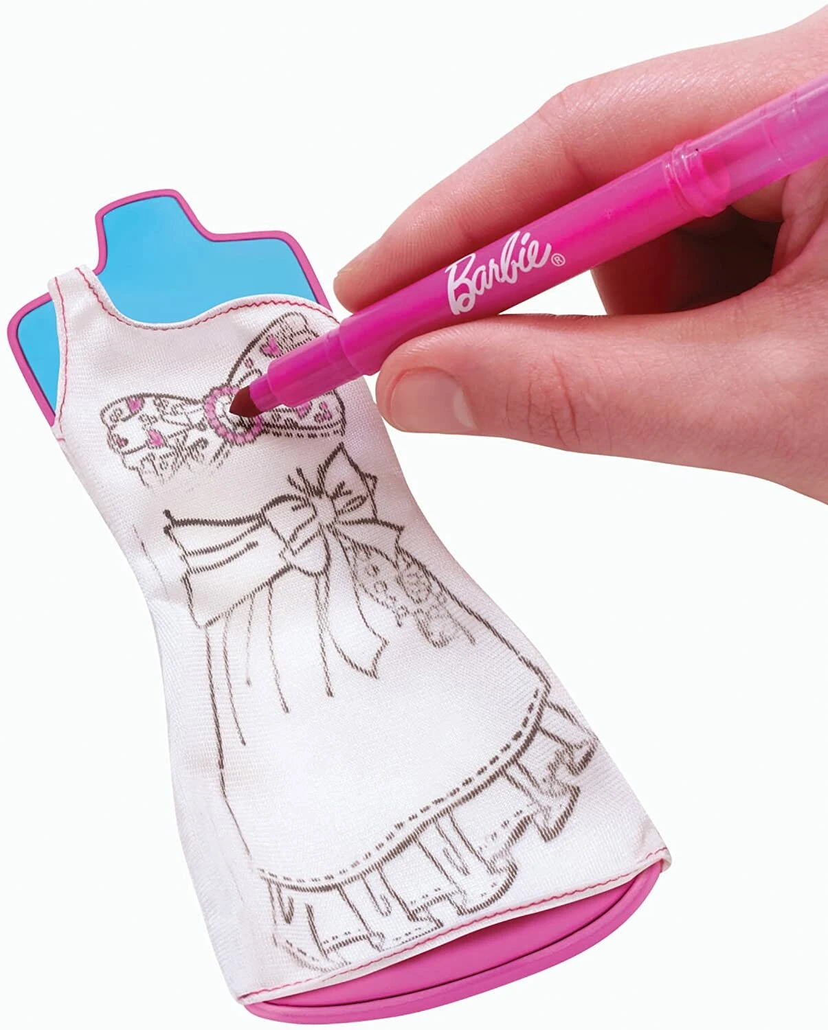 - Contient : 1 poupée Barbie, 3 robes à customiser, 3 feutres (bleu / rose / violet), 6 formes en relief, 1 applicateur, 1 cadre, 3 papiers transfert et 2 planches de stickers
