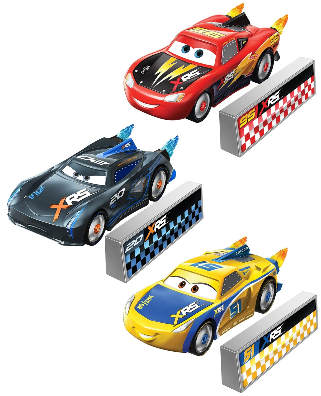 Que la course commence avec les personnages de la collection Cars XRS Rocket Racing ! Ce pack comprend 3 voitures Cars : Lightning McQueen (95), Jackson storm (20) et Cruz Ramirez (51). Les voitures sont équipées de flammes animées sortant des pots d’échappements. Lorsque le véhicule roule, les flammes tournent !