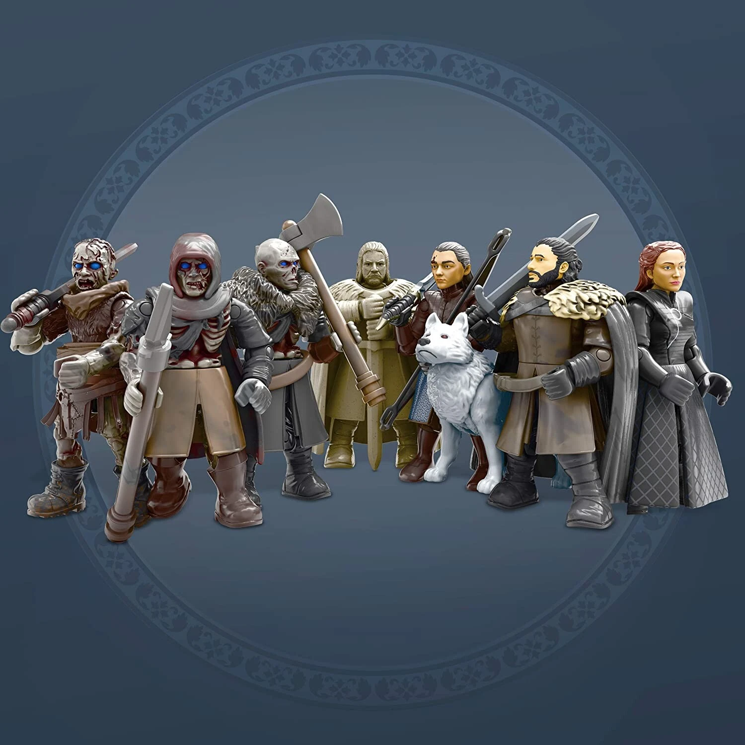 - Comporte 7 figurines : Jon Snow, Sansa Stark, Arya Stark, 3 marcheurs blancs, chacun avec une arme personnalisée + le loup Ghost