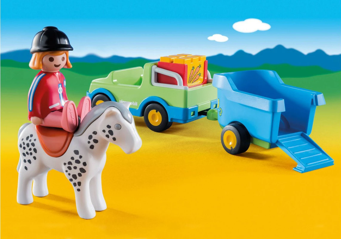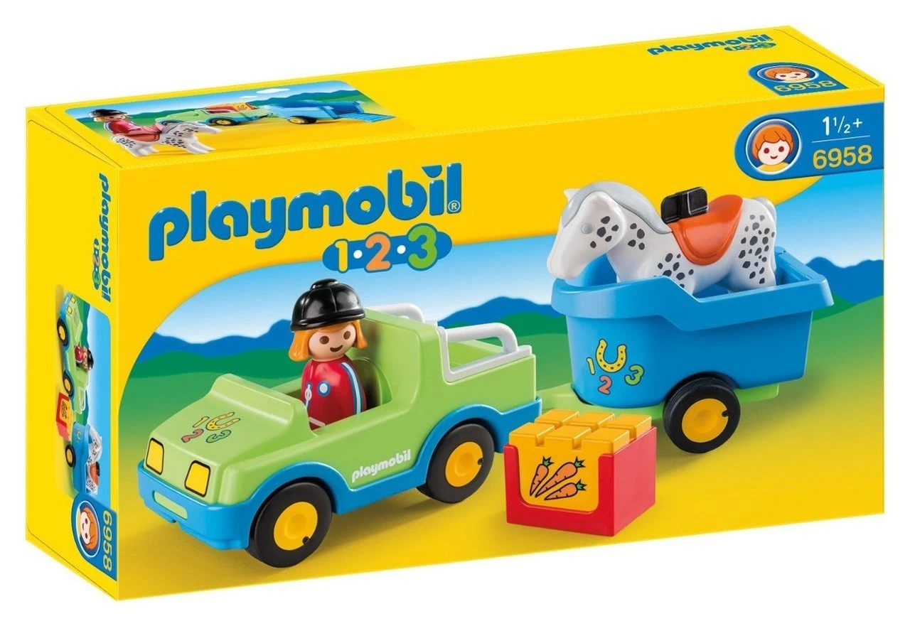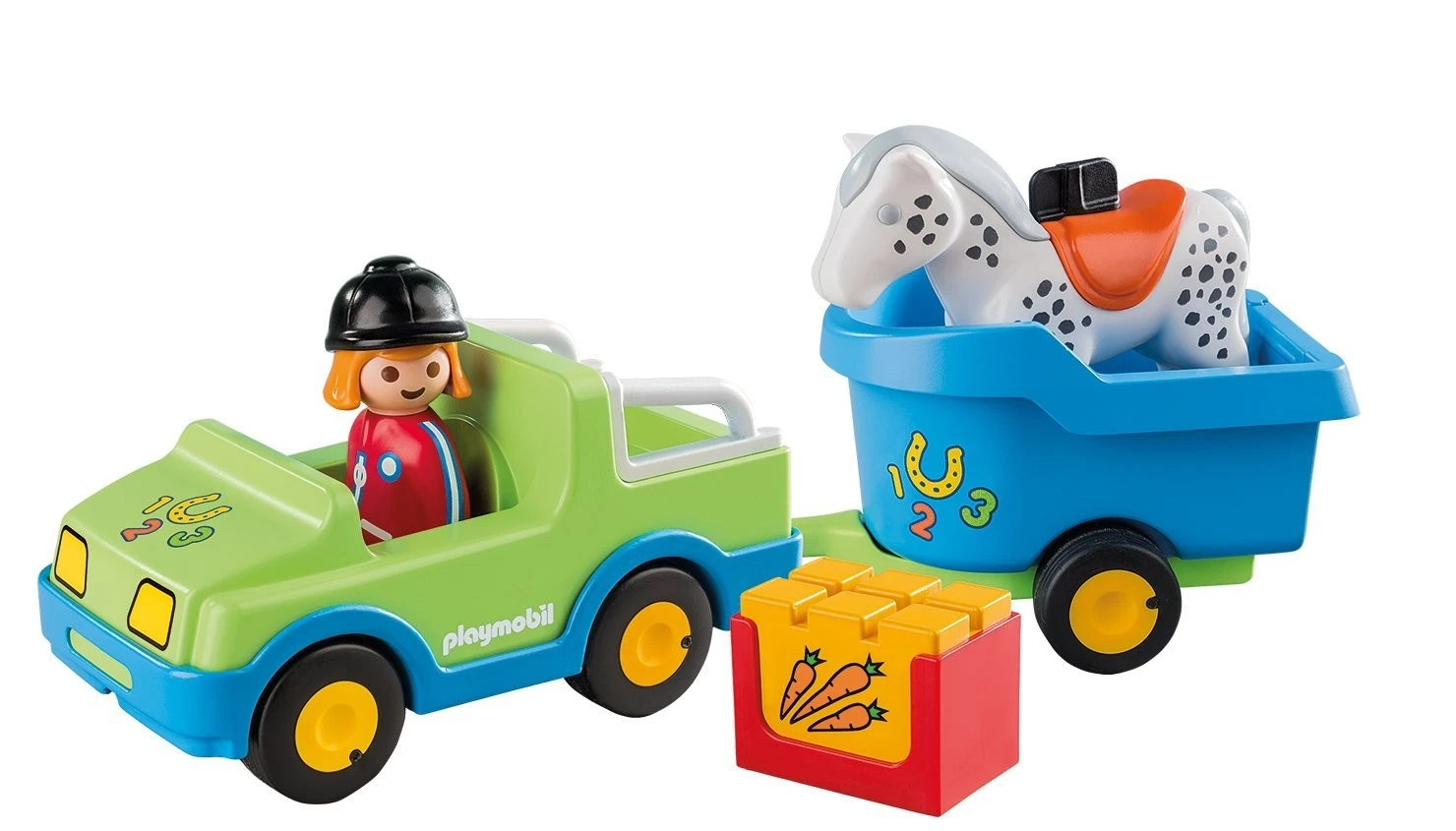 Découvrez la collection Playmobil 1 2 3 destinée aux petits avec aucun élément ne pouvant être avalé pour jouer sans risque. Ce pack Voiture et remorque à Cheval intègre un personnage, sa voiture et la remorque ainsi que le beau cheval tacheté !