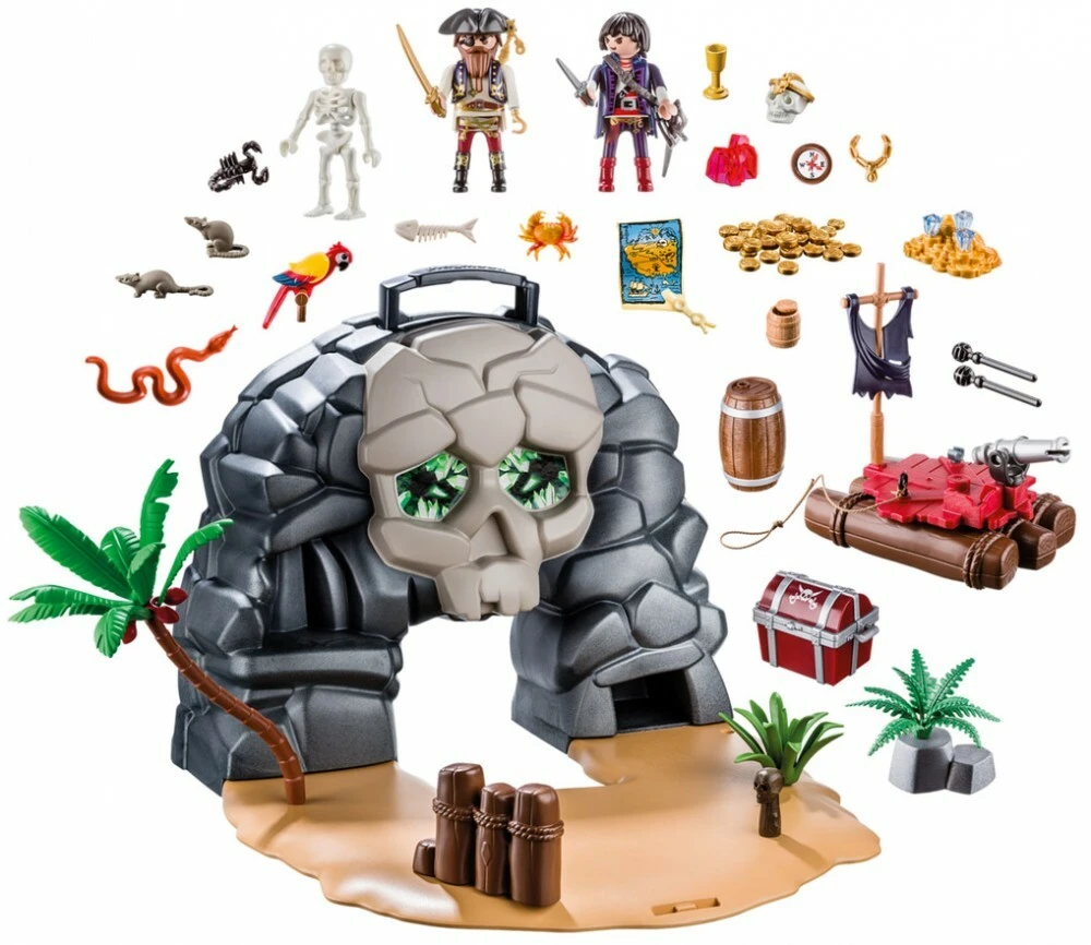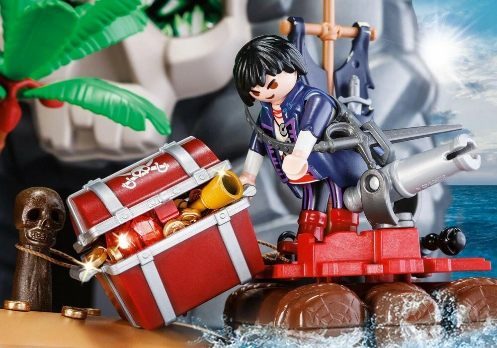 - La boîte contient 2 figurines Playmobil, 1 île, 1 radeau avec un canon, 2 munitions, 1 squelette et plus de 50 accessoires