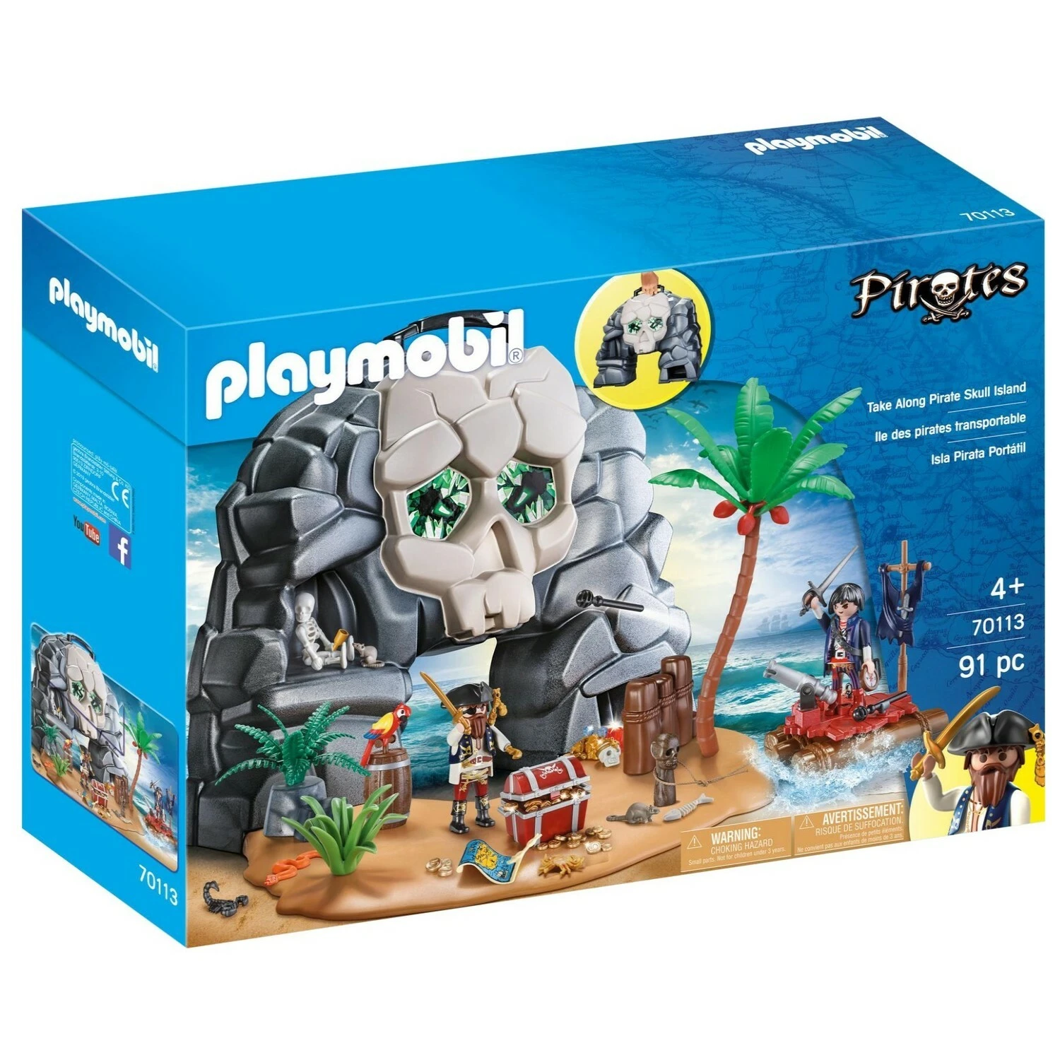 Le capitaine et son moussaillon partent à la recherche d’un trésor pirate caché sur l’île de la tête de mort ! La boîte Playmobil 70113 : Île aux pirates contient plus de 50 accessoires pour créer un décor personnalisé et imaginer des histoires folles. Cependant, prends garde à ton équipage… on raconte que plusieurs pirates mystérieusement disparus sur cette île !
