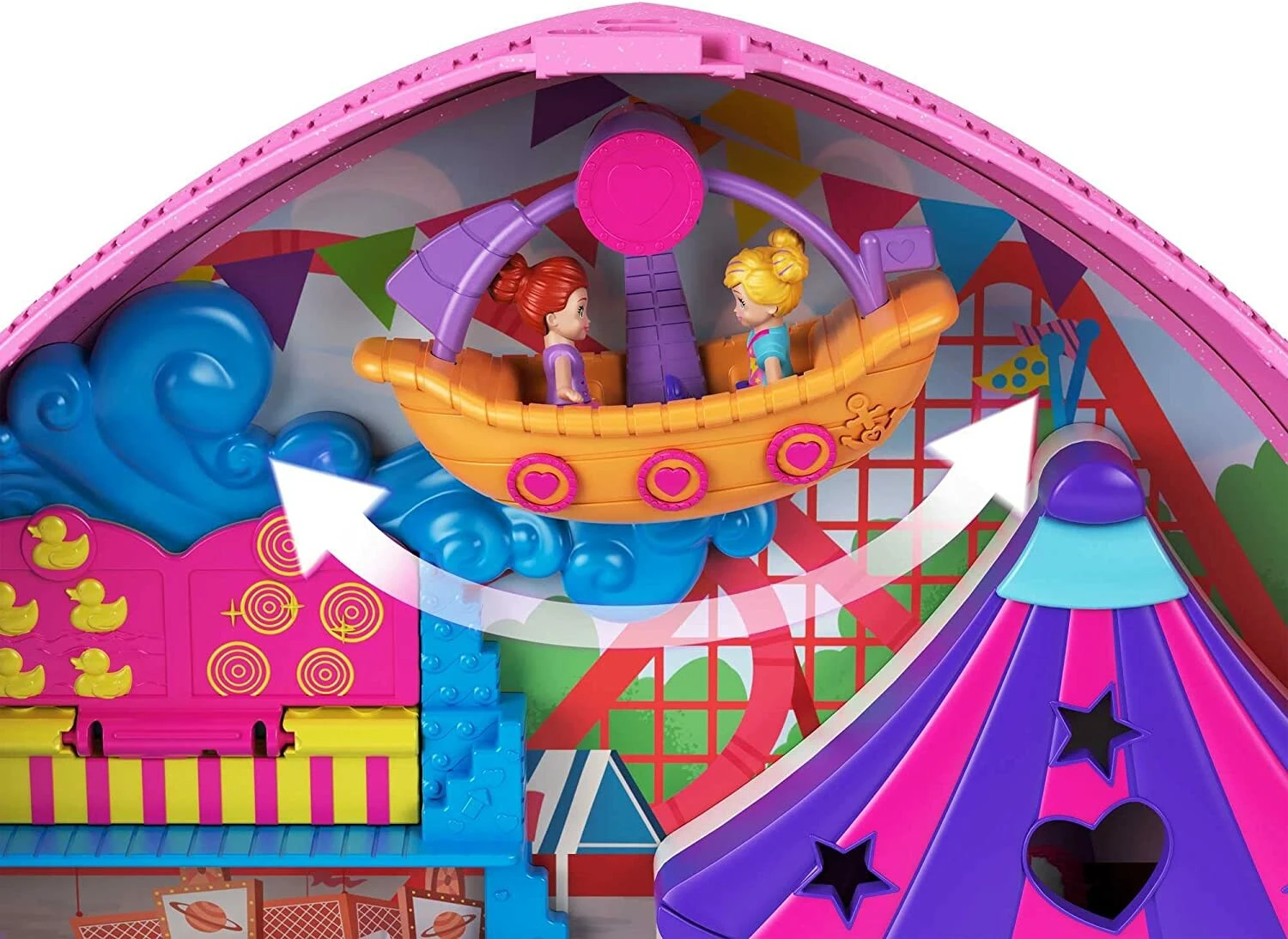 Vous allez enfin pouvoir emporter avec vous un parc d’attractions et pleinement profiter de nombreuses activités dans le monde miniature des Polly Pocket. Ouvrez ce magnifique sac à dos en forme de cœur et déployez les différentes attractions. Polly et Lila peuvent faire les auto-tamponneuses, les montagnes russes, tournoyer dans les tasses ou le tourniquet, faire une photo souvenirs, profiter du grand carrousel, se balancer sur le bateau pirate, assister à un spectacle dans un chapiteau, se restaurer dans un espace dédié ou encore faire une partie de mini-golf.