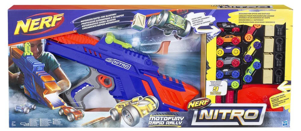 Vous croyiez que les pistolets Nerf ne permettaient que de tirer des fléchettes et balles en mousse ? Alors jetez un œil au Nitro Rapid Rally : ce ne sont pas des fléchettes qui sont propulsées à des vitesses folles mais bien des voiturettes ! Avec sa forme spéciale, le fusil peut être posé au sol pour un démarrage optimal de la voiture. Le chargeur peut contenir plusieurs voiturettes pour des lancements en rafale !
