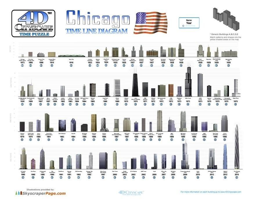 Le puzzle comprend plusieurs répliques de constructions bâties de 1916 jusqu’en 2015. Le puzzle comprend des structures emblématiques comme l’Aon Center, l’hôtel Trump ou la Willis Tower.
