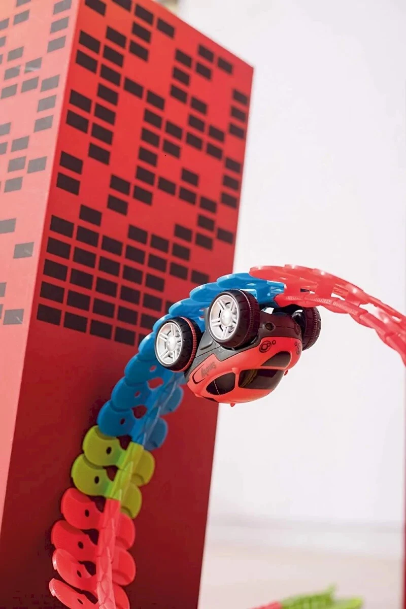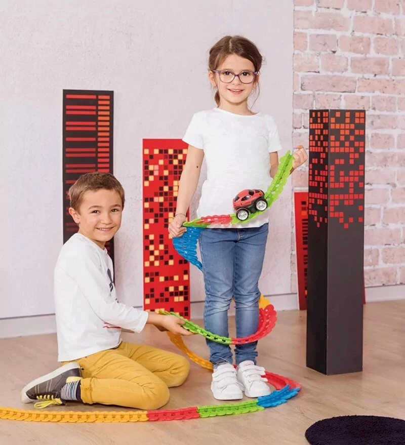 le circuit de voiture fleXtreme est incroyablement facile à utiliser. il suffit de connecter les papillons en plastique pour créer une piste colorée et flexible. Les pistes s’emboîtent facilement et sont si flexibles que vous pouvez même les faire passer sur des chaises, des lits et d’autres meubles pour créer un parcours vraiment dynamique et passionnant. Votre enfant adorera faire appel à sa créativité pour créer la piste la plus étonnante possible, et les possibilités sont vraiment infinies.