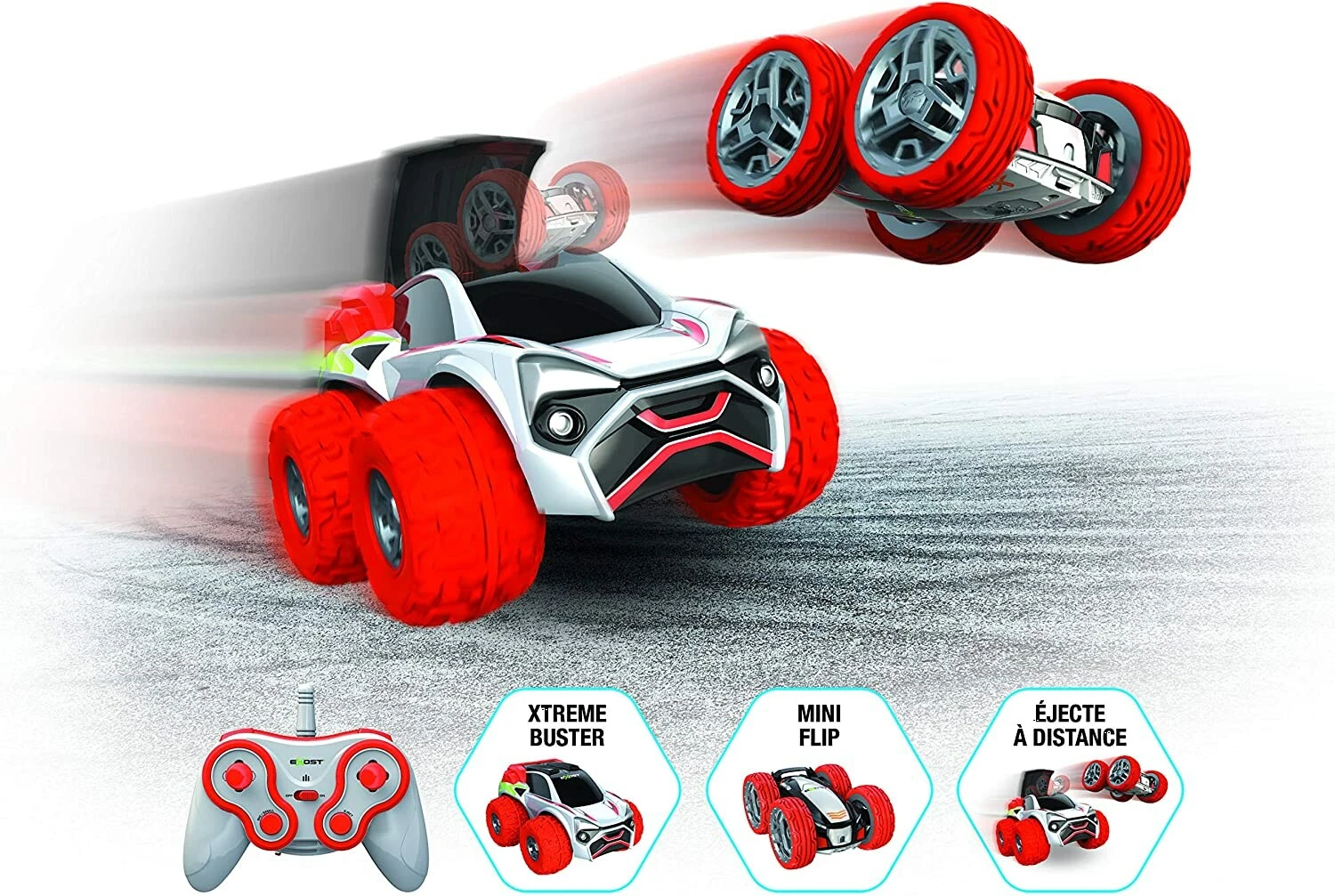 Découvrez la Xtreme Buster ! Prenez les commandes de ce 4×4, et éjectez la Mini Flip de son coffre ! Cette voiture télécommandée 2 en 1 se lance dans la course à toute vitesse ! La Mini Flip qui accompagne le 4×4 peut réaliser des figures à 360° !